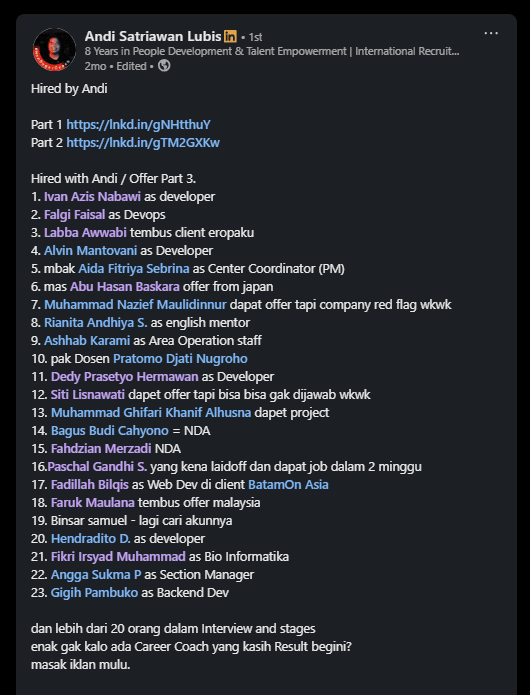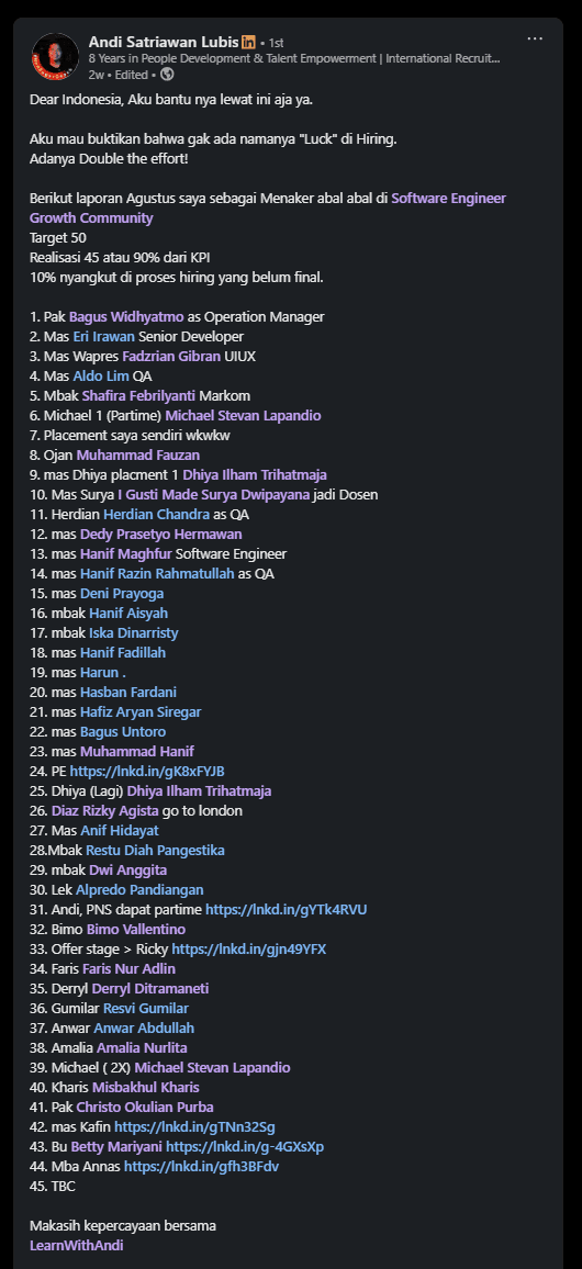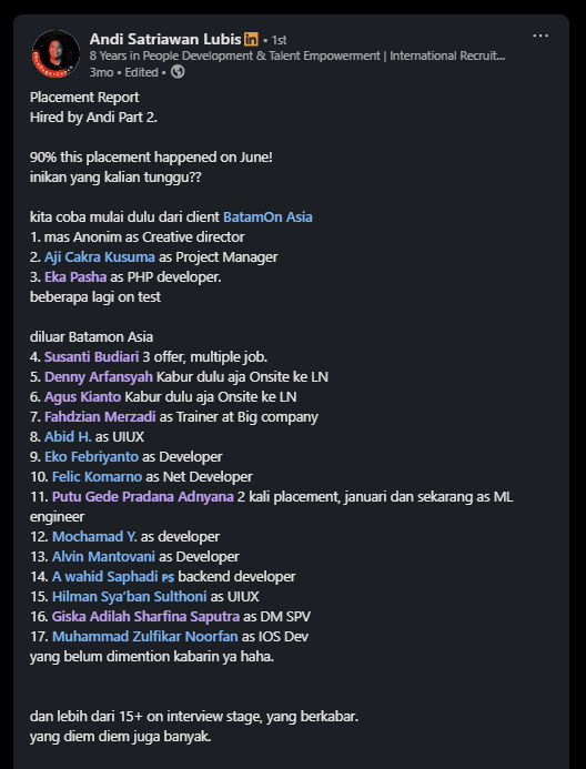 Tidak ada jaminan instan di LearnWithAndi, tapi bagi setiap anggota yang serius aktif bertanya, konsisten mengerjakan tugas, dan mengikuti arahan mentor terbukti banyak yang berhasil mendapat pekerjaan sesuai bidangnya dalam 30–90 hari, bahkan ada yang hanya butuh 14 hari. Kami bantu semaksimal mungkin lewat revisi CV dan profil LinkedIn, simulasi wawancara kerja (mock interview), hingga strategi melamar kerja yang relevan dengan industri. Bahkan, kami juga mengundang beberapa rekruter untuk langsung men-screening progres kamu dan memberi peluang bergabung di perusahaan mereka. Kesuksesanmu sangat bergantung pada komitmen dan usaha yang kamu berikan, dan kami akan selalu ada untuk mendukung setiap langkahmu..